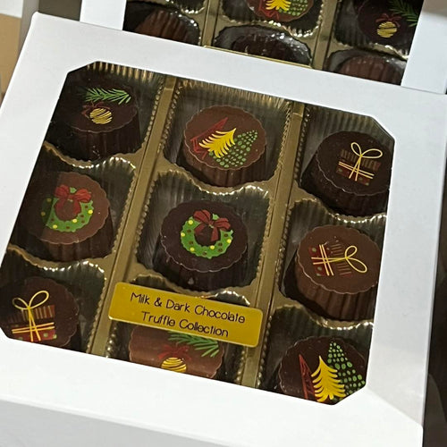 We offer a variety of traditional truffles in mini bite-sized truffles as well as full sized truffles. We have several specialty truffle collections including our Artisan Truffle Collection (vegan), Cupcake Truffle Collection, Dessert Truffle Collection, and a variety of Holiday Truffles. Our truffles do not contain alcohol, and are made with emulsions (meaning flavors such as Champagne or Rum do not contain actual alcohol).
